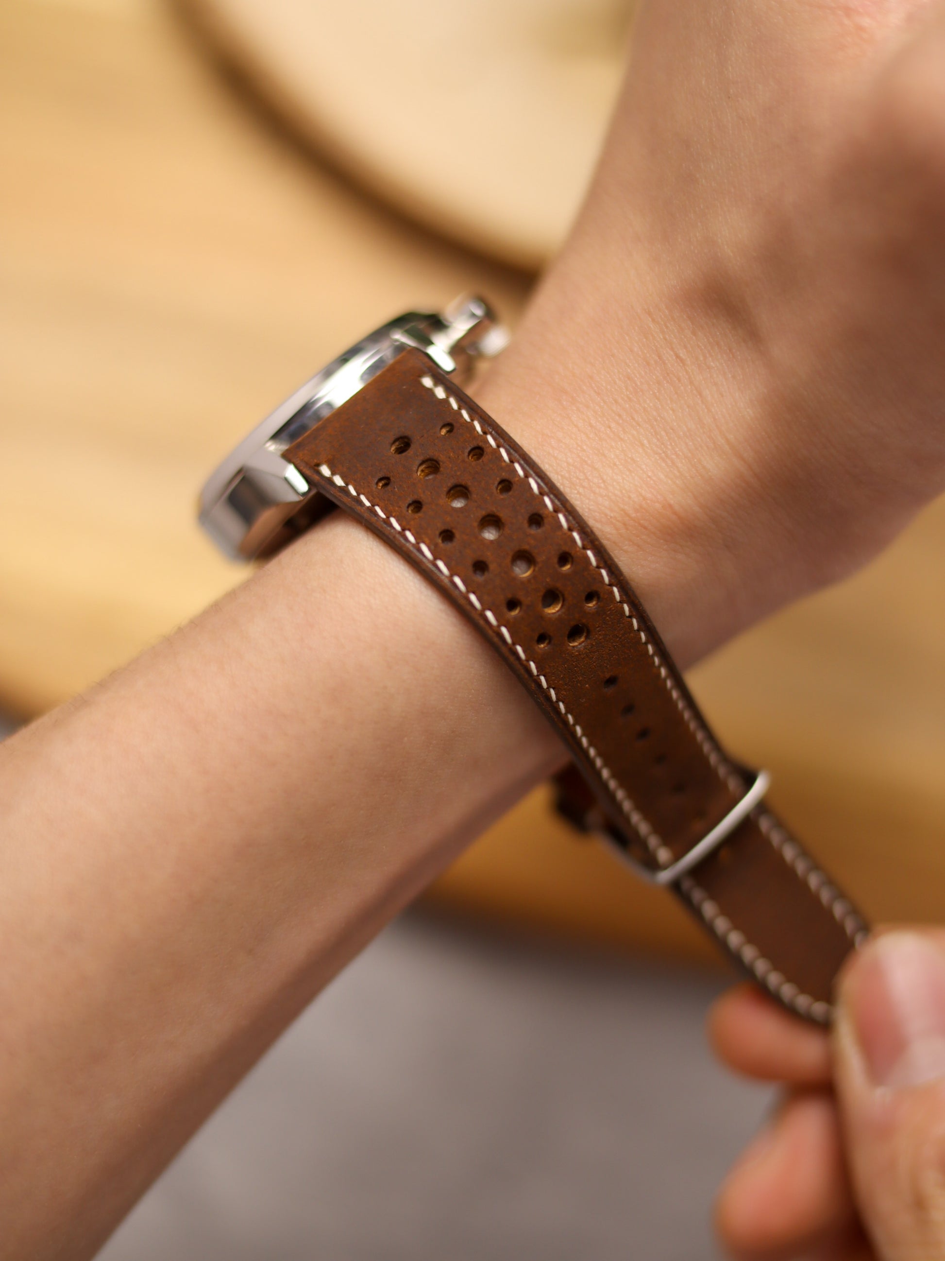 We pride ourselves in our crafts through the highest standards of precision, accuracy, and durability. Unlike regular machine-made straps, all our straps are 100% saddled stitched by hand to reinforce structural integrity and sturdiness. Thereafter, a sequential and painstaking process of sanding and applying of edge paint glue are performed, to ensure all edges are completely sealed with a smooth and thorough finish.